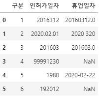 '휴업일자':[20160312.0,'2020 320',201603.0,NaN,'2020-02-22','']})