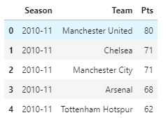 위와 같이 파일의 내용이 나옵니다. 우리는 여기서 Season, Team, Pts(전체 포인트)만 사용하겠습니다.