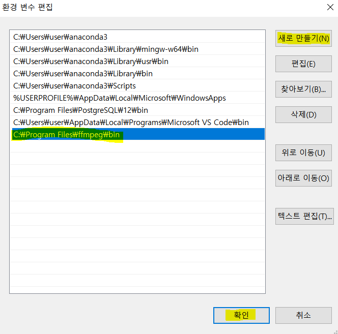 새로 만들기 > ffmpeg.exe 가 있는 주소 입력 > 확인을 차례대로 눌러주세요.