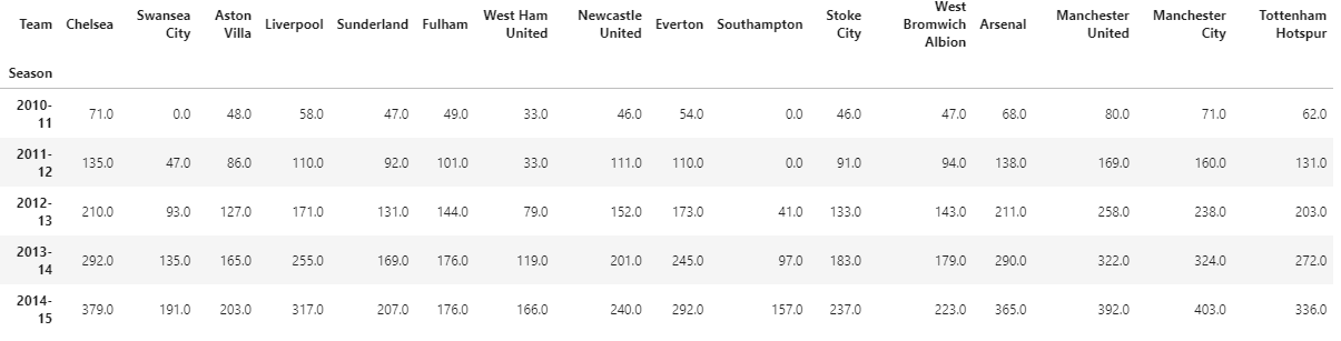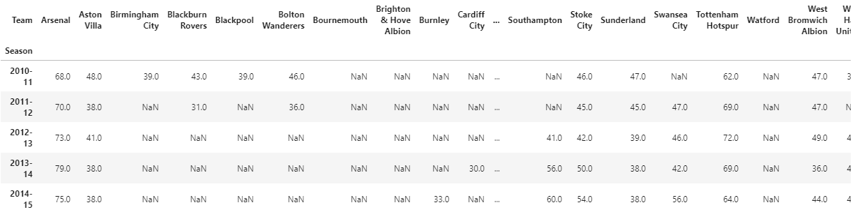 df = EPL.pivot_table(values='Pts', index = ['Season'],columns='Team')