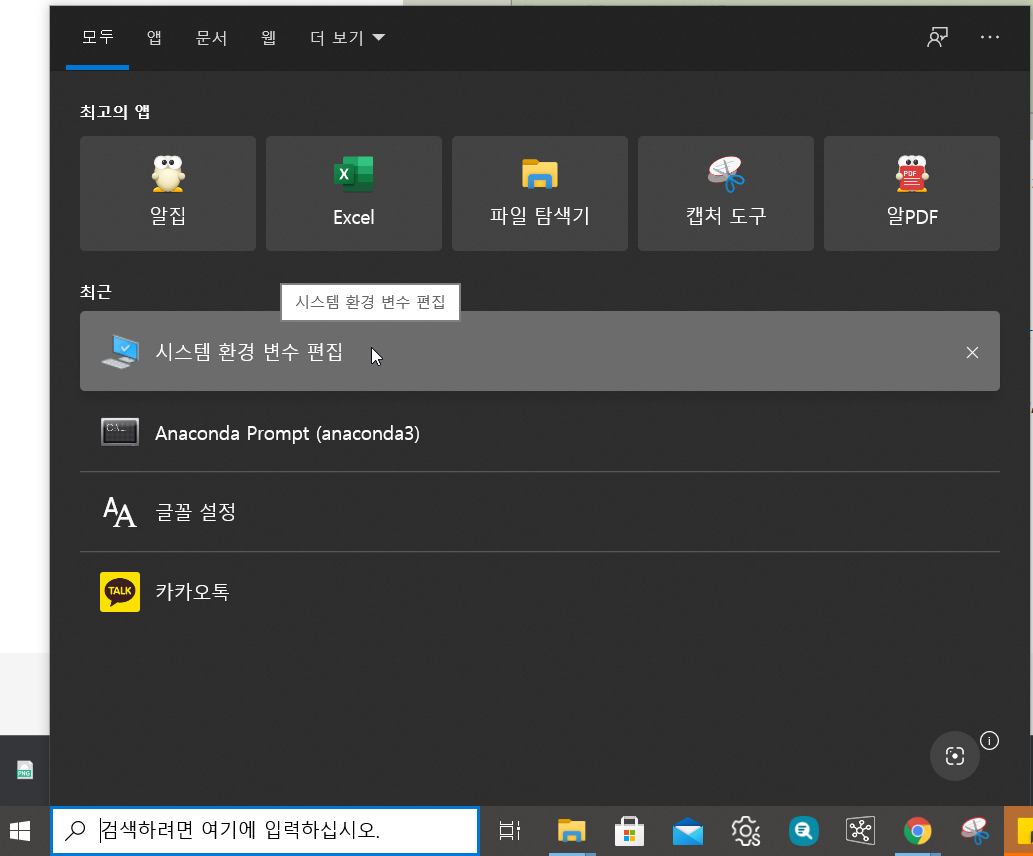 윈도우 검색창에 시스템 환경 변수 편집을 타이핑하고 클릭하여 주세요.