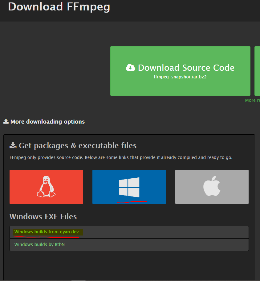 파란 윈도우 아이콘 선택 후 Windows builds from gyan.dev를 클릭하여 줍니다.