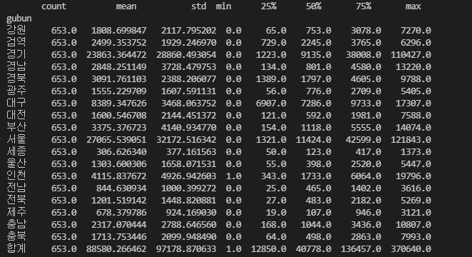 print(df.groupby('gubun').defCnt.describe())