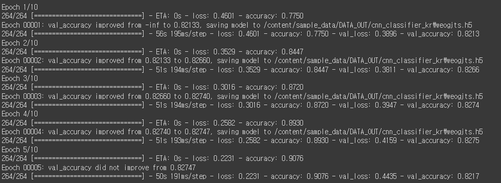 에포크는 10으로 주어 학습을 진행하고, 검증 정확도가 그전보다 낮아지면 학습을 멈추도록 설계하였습니다.
