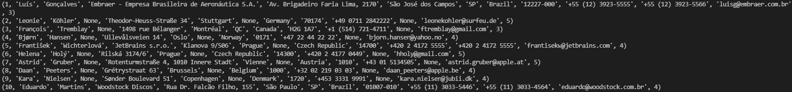 SELECT_SQL = 'SELECT * FROM customers LIMIT 10;' #Where Country = "Austria";'#특정 국적의 사람만 정보 가져오기