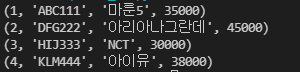 #cursor.execute(INSERT_SQL, ('KLM444','아이유', 38000))