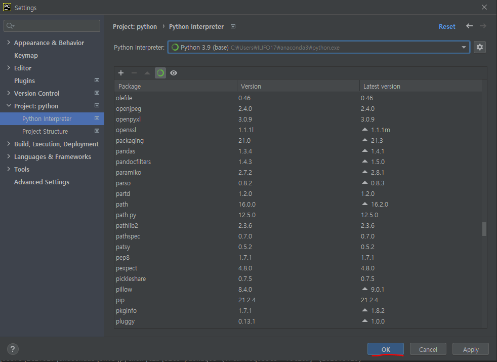 그 후 anaconda가 설치된 파일의 폴더로 들어가 python.exe를 클릭하여 준 후 OK를 눌러 줍니다.