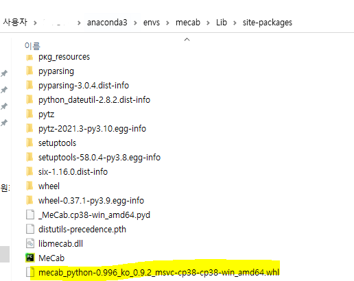 다운받은 'mecab_python-0.996_ko_0.9.2_msvc-cp38-cp38-win_amd64.whl' 파일을 mecab 가상환경 site-packages에 위치시켜 주세요.