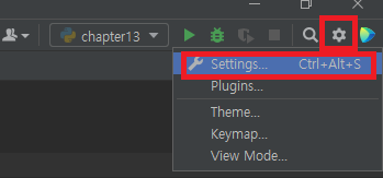 그 후 파이참 우측 상단의 톱니바퀴를 눌러 Settings로 들어가 줍니다.