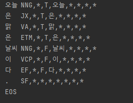 out = mecab.parse("오늘은 맑은 날씨이다.")