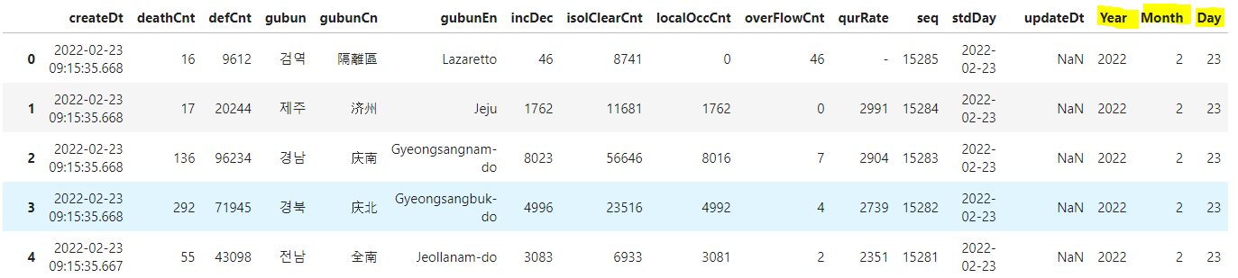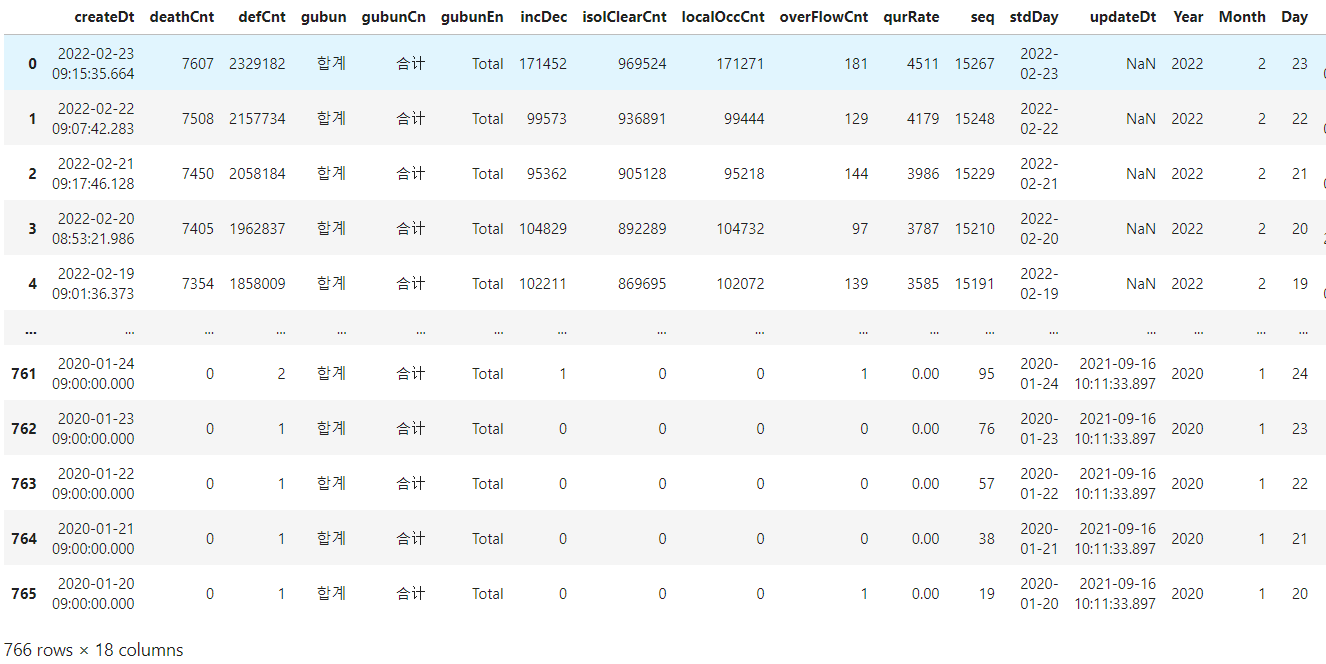 주의할 점은 df프레임에서 바로 .year을 하면 오류가 나고, covid_df['stdDay'][0] 처럼 개별 데이터로 접근 후 .year을 해야