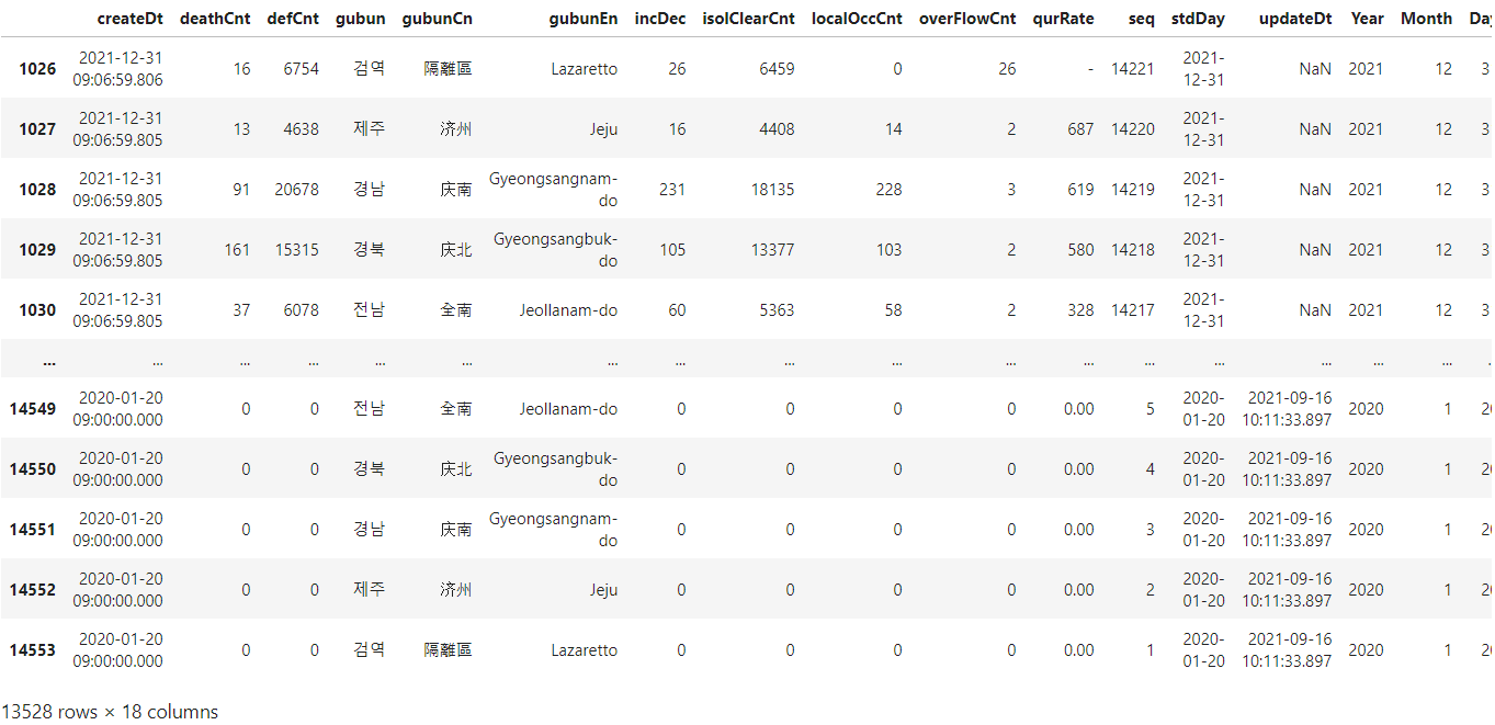 예시로 코로나 데이터의 2021년 데이터만 추출해 보도록 하겠습니다.