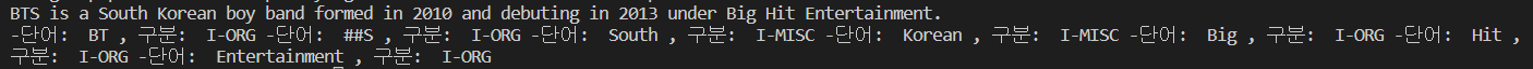 print("-단어: ",result[i]['word'],", 구분: ",result[i]['entity'],end=' ')