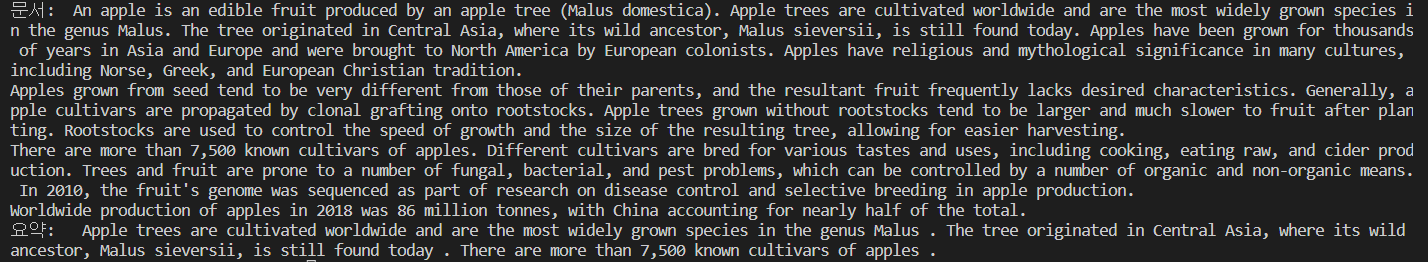 요약으로 긴 문장을 3문장 정도로 축약한 것을 확인할 수 있습니다.