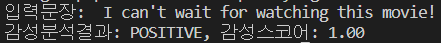 sentence = "I can't wait for watching this movie!" #감성분석하고 싶은 문장 입력