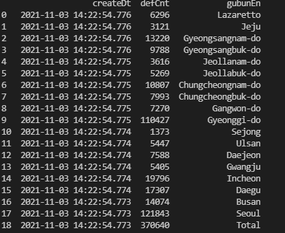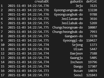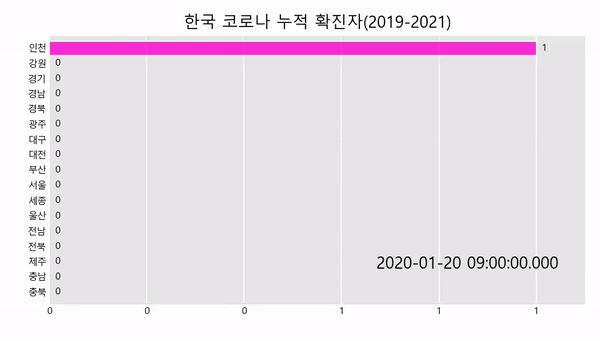 | [python] 공공데이터 코로나 확진자 데이터로 bar_chart_race 시각화하기 (3) | 2021.11.08 |