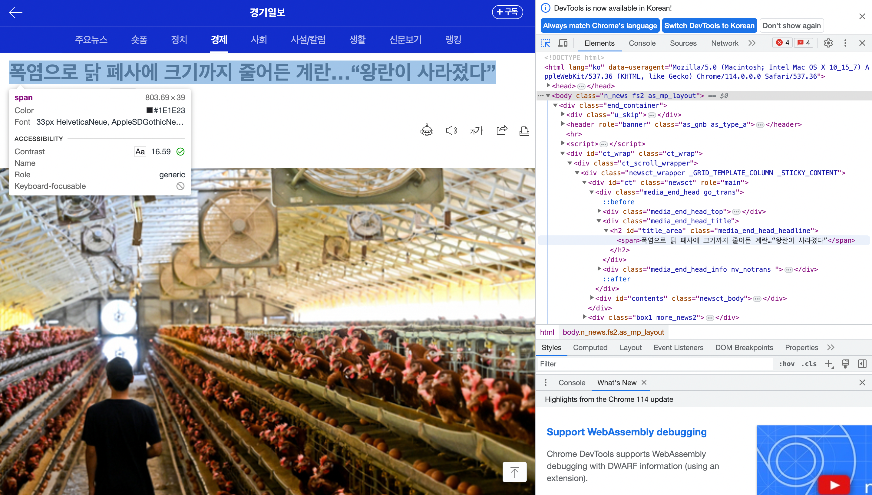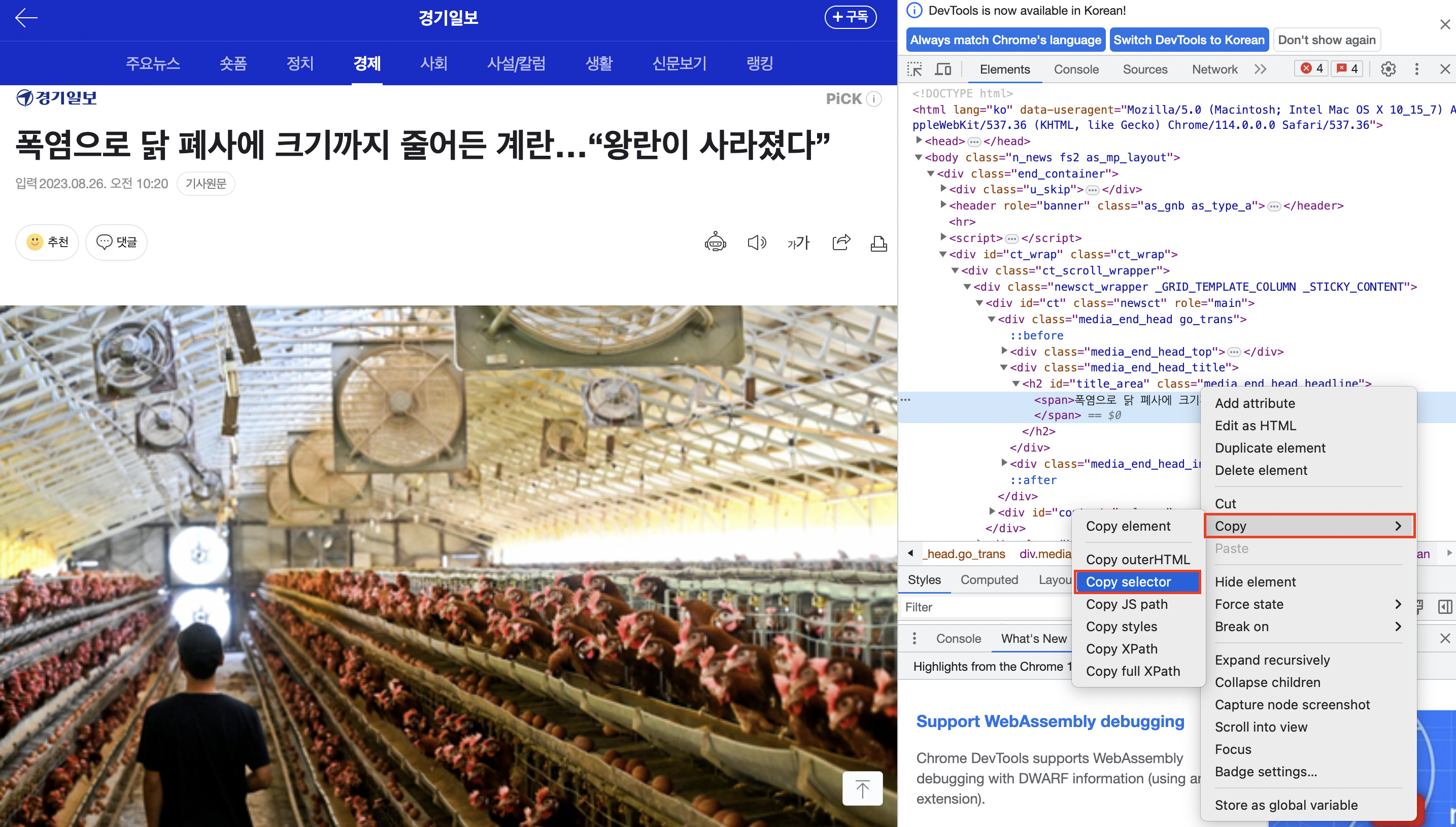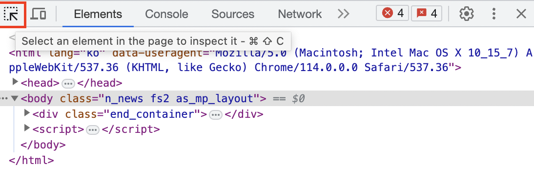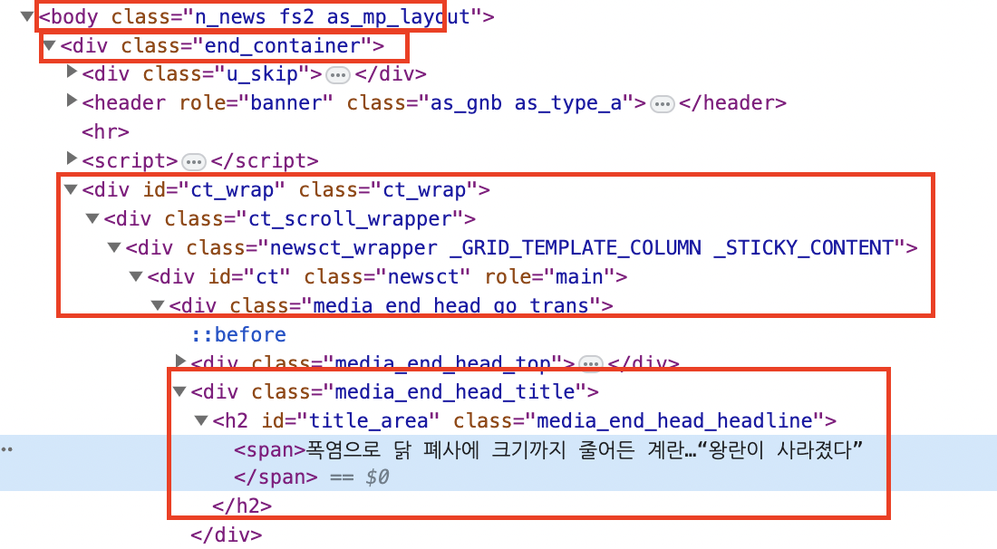 여기서 원래대로라면 body 밑에 div class name이 end_container인것 밑에 div ct_wrap 밑에 ct_scroll_wrapper 밑에 newsct... 밑에 이런 식으로 쭉쭉 타고 내려가서 h2에 span 에 제목이 위치해 있는 것을 확인할 수 있겠습니다만 귀찮고 복잡합니다.