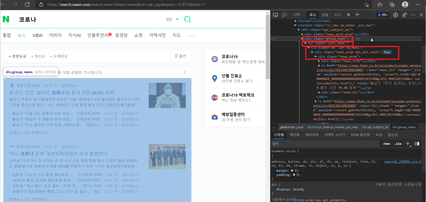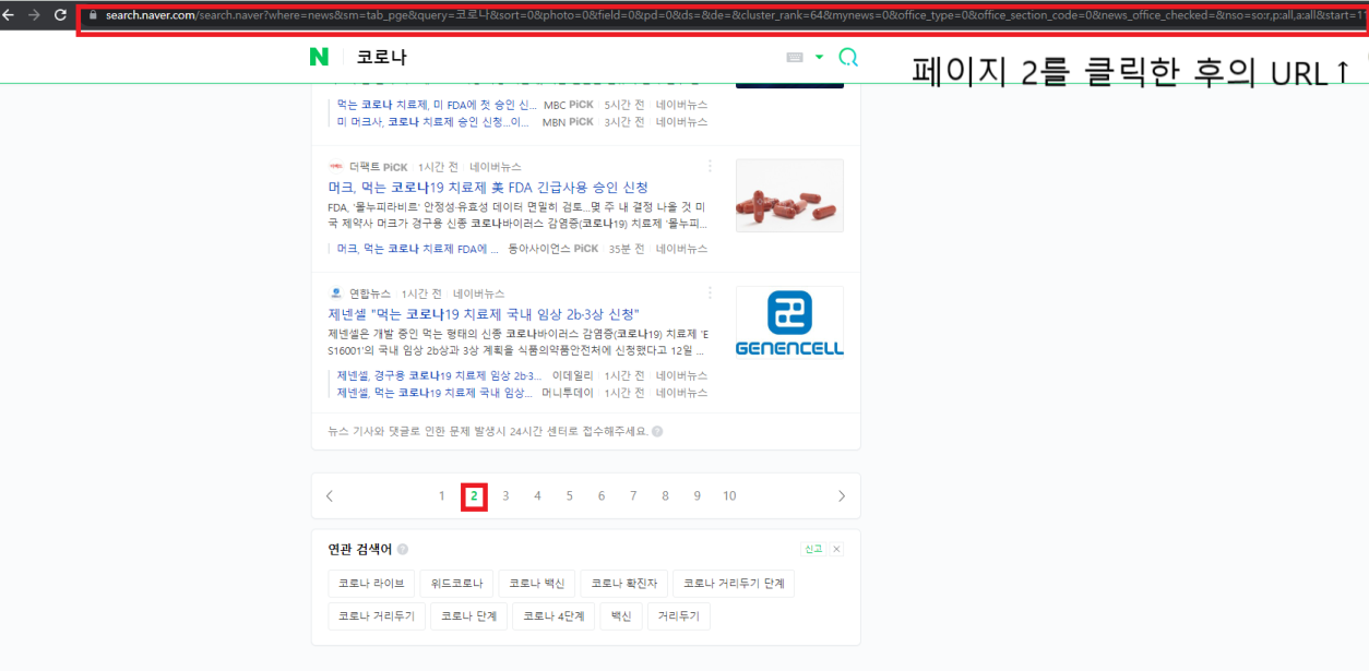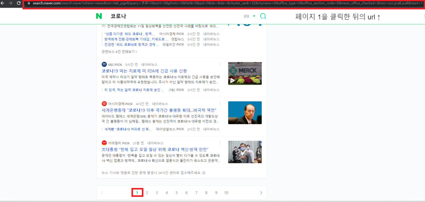 <페이지 1을 클릭한 뒤의 URL> https://search.naver.com/search.naver?where=news&sm=tab_pge& query=코로나 &sort=0&photo=0&field=0&pd=0&ds=&de=&cluster_rank=32&mynews=0&office_type=0&office_section_code=0&news_office_checked=&nso=so:r,p:all,a:all& start=1