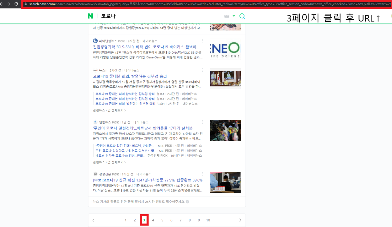 <페이지 3을 클릭한 뒤의 URL> https://search.naver.com/search.naver?where=news&sm=tab_pge&query=코로나&sort=0&photo=0&field=0&pd=0&ds=&de=&cluster_rank=87&mynews=0&office_type=0&office_section_code=0&news_office_checked=&nso=so:r,p:all,a:all&start=21