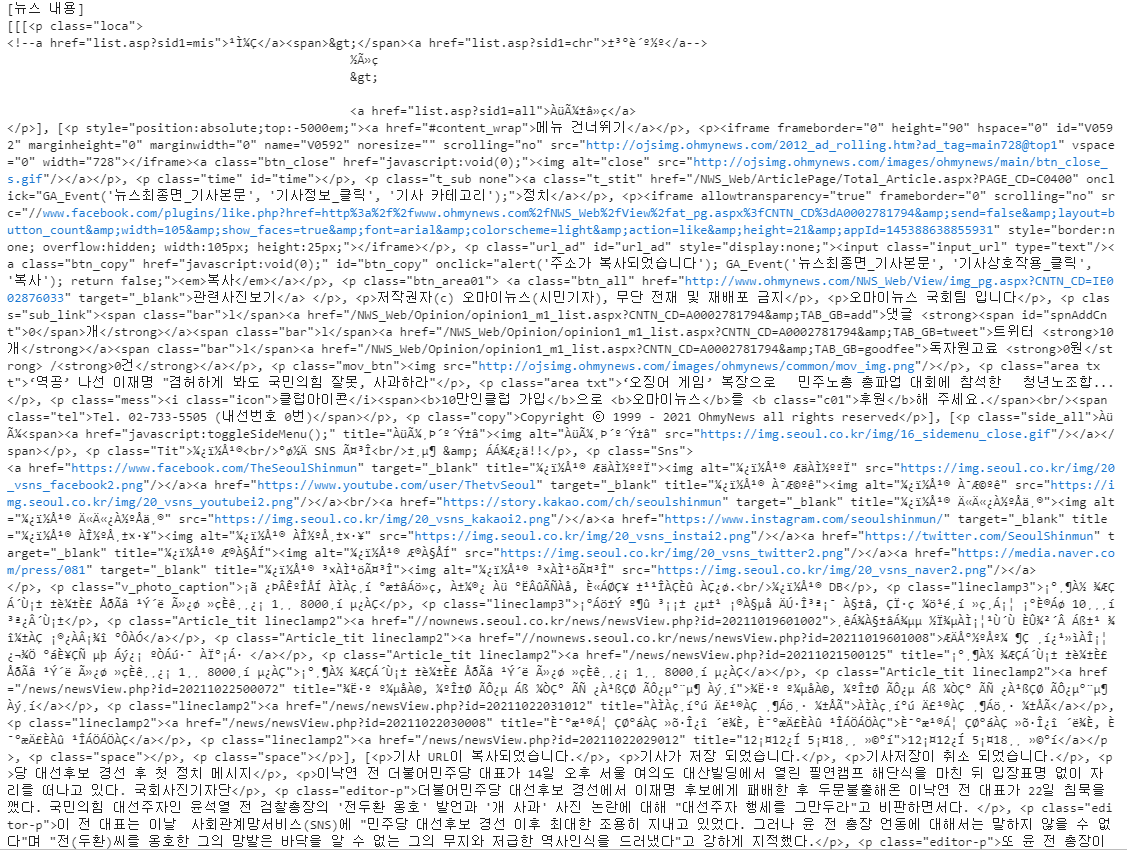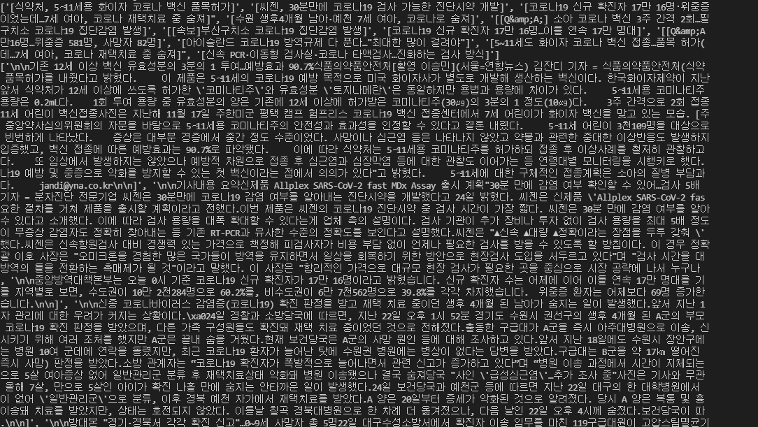 기사의 모든 본문을 가지고 있지만 본문 뿐만이 아니라 p태그의 모든 내용이 크롤링 되기 때문에 크롤링 후 전처리가 필수적으로 진행이 되어야 합니다. 추후 전처리에 관련해서도 포스팅 할 예정입니다.