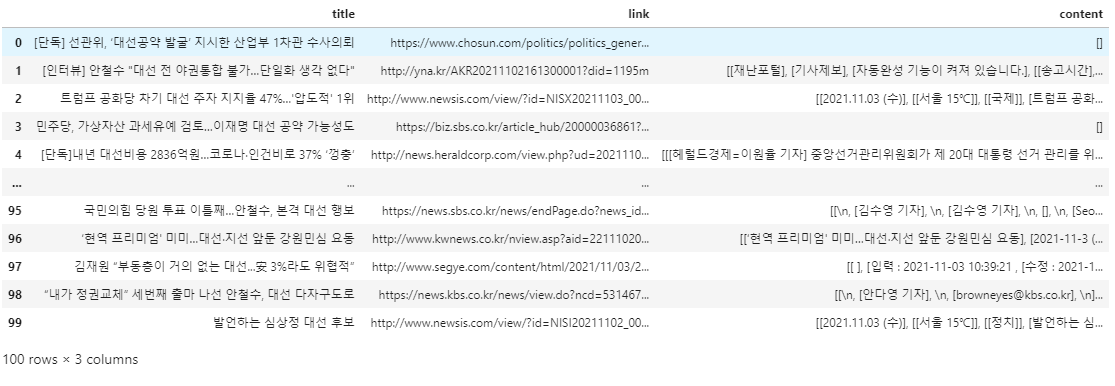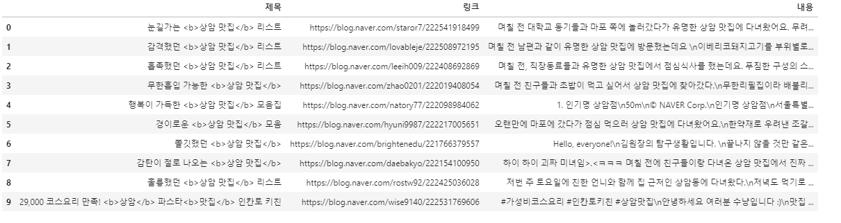 마지막으로 아까 추출한 제목, 블로그 링크, 내용을 DataFrame으로 만들어 깔끔하게 정리해 보도록 하겠습니다.