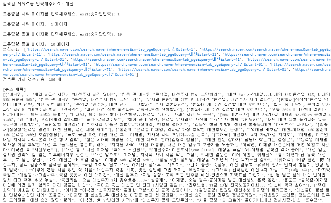page = int(input("\n크롤링할 시작 페이지를 입력해주세요. ex)1(숫자만입력):")) # ex)1 =1페이지,2=2페이지...