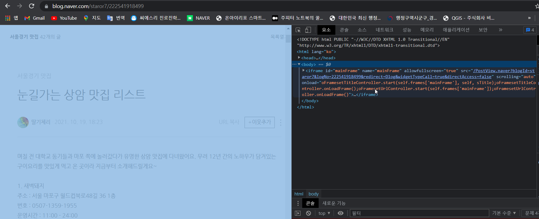 NAVER 블로그는 각 게시물에 들어가 보면 아래와 같이 iframe 안에 게시물 본문 글이 위치하여 있습니다.