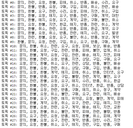 토픽 모델링 한 결과는 아래와 같습니다. 각 토픽별로 상위 20개 단어를 보도록 하겠습니다.