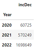 그럼 0부터 765까지 전체 행의 인덱스가 잘 정리되었습니다. 그 후 groupby를 사용하여 'Year'을 기준으로 합계를 구해 줍니다. 우리가 필요한 정보는 코로나 확진자 정보이므로 'incDec' (전일 대비 코로나 환자 수) 열의 합계만을 출력해 보겠습니다.