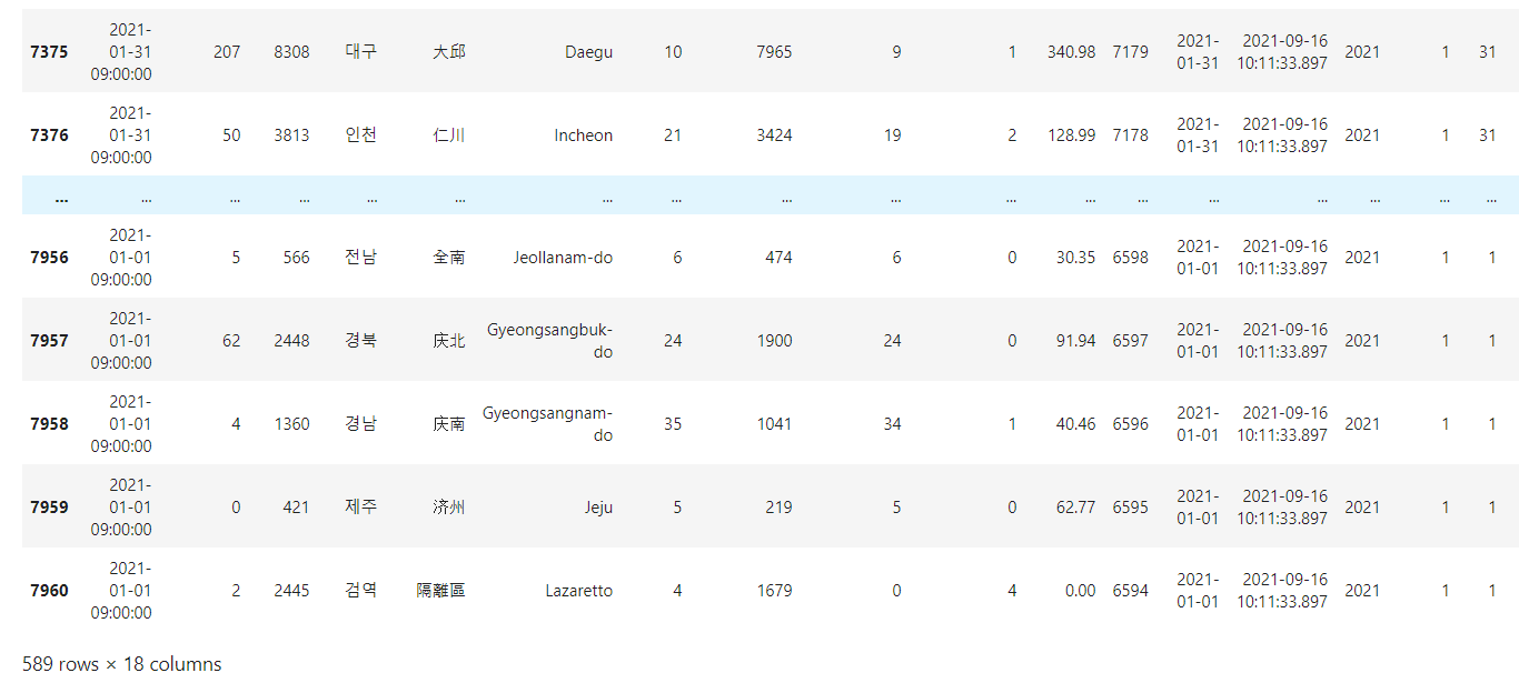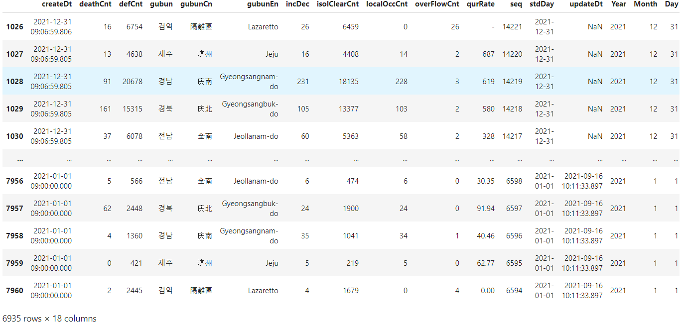 위처럼 조건을 지정하여 추출이 가능합니다. 예시로 코로나 데이터의 2021년 데이터만 추출해 보도록 하겠습니다.