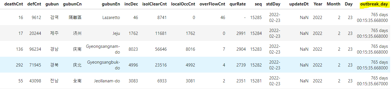 이것을 기준으로 하여 각 행마다 며칠이 지났는지 계산해 보겠습니다. 각 행의 createDt에서 최초 발생일을 빼서 구할 수 있습니다. outbreak_day = 등록일시 - 최초발생일
