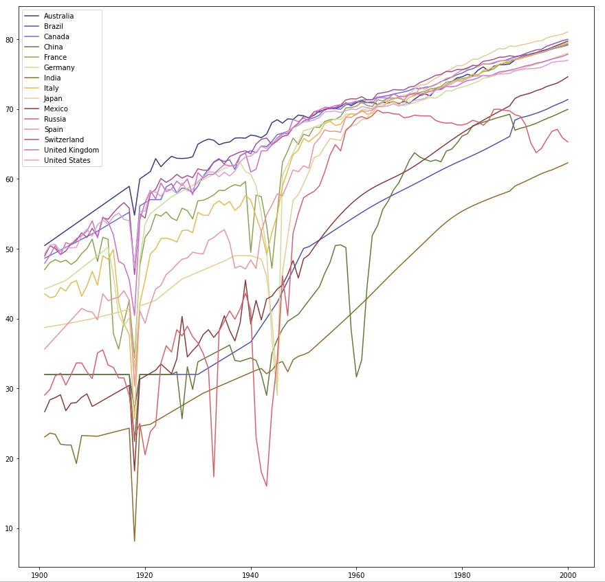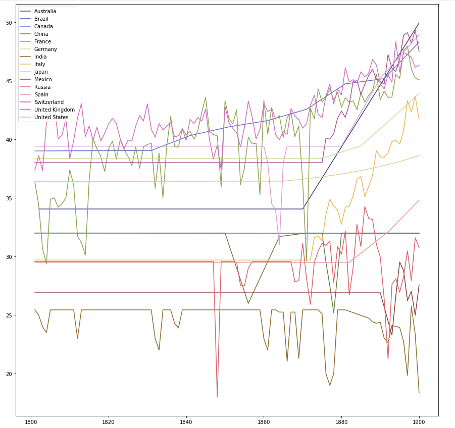 matplotlib을 사용하여 그래프를 그리고, 국가 수 가 많으므로 범례를 추가해 주고 색도 각자 다른 색으로 추가해 주겠습니다.