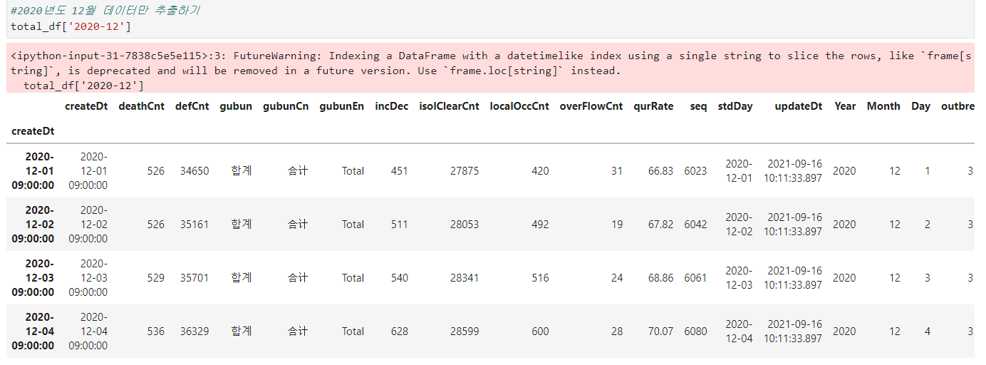 위의 .loc을 사용할 때보다 더욱 간편하게 원하는 기간의 추출이 가능합니다만, 위 사진 빨간 박스에 있는 경고메세지에서는 곧 이 기능이 사라진다고 하니 참고해 주시길 바랍니다. loc을 사용하라고 권장하고 있네요.