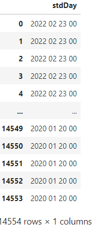 주의할 점은 df프레임에서 바로 .year을 하면 오류가 나고, covid_df['stdDay'][0] 처럼 개별 데이터로 접근 후 .year을 해야 원하는 정보를 찾을 수 있습니다. 열별로 한번에 데이터를 얻고 싶으면 dt를 사용하여 한번에 추출할 수 있습니다. 예시로, createDt에서 년, 월, 일을 추출해 각각 새로운 컬럼을 만들어 거기에 저장해 주도록 하겠습니다.