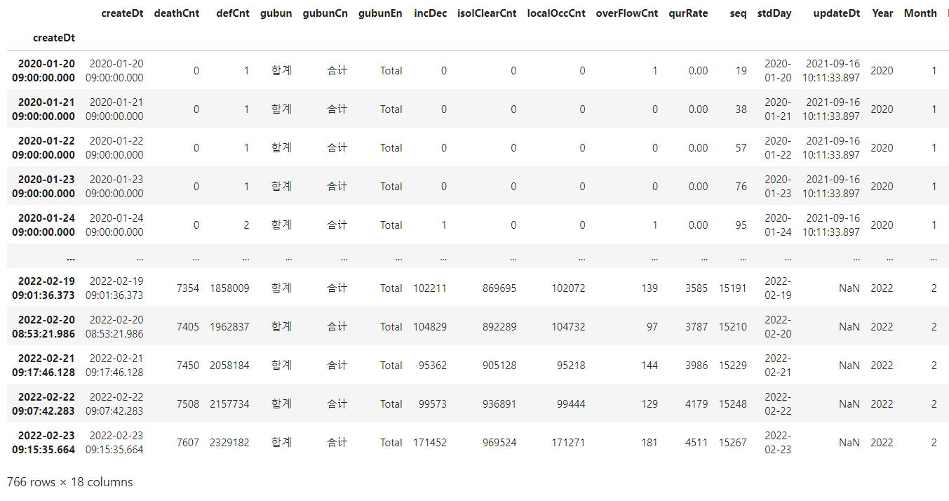 datetime 을 인덱스로 지정하면 따로 조건을 지정하지 않아도 원하는 날짜 부분의 추출이 바로 가능합니다. 우선 합계 df 인 total_df가 최신 날짜 순으로 지정되어 있어 오래된 날짜 순으로 정렬한 뒤, 인덱스를 datetime 인 createDt열로 바꾸어 보겠습니다.