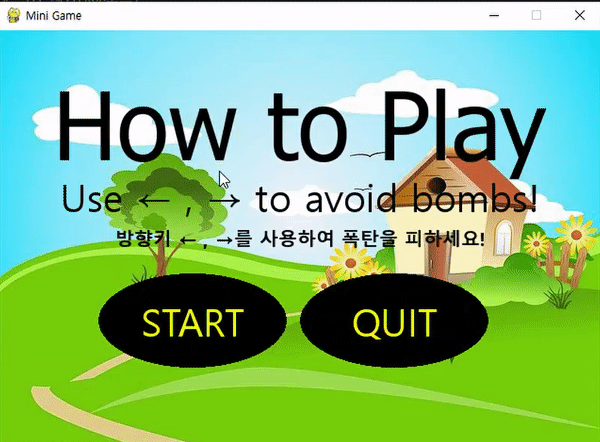 start를 누를 시 게임을 시작하고, quit을 누르면 창이 닫히도록 game_intro 함수를 만들어 주었습니다.