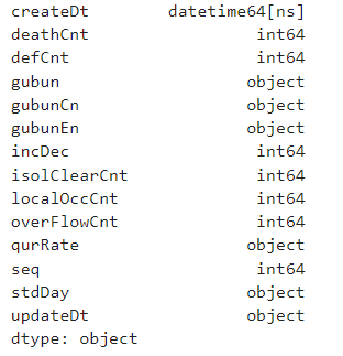 다음으로는 csv를 불러올 때 parse_dates = [열인덱스]를 사용하여 변경하는 방법입니다. 코로나csv 파일에서 createDt가 0번째 열이므로 [0] 을 입력해 줍니다. 그후 데이터 타입을 출력해 봅니다.