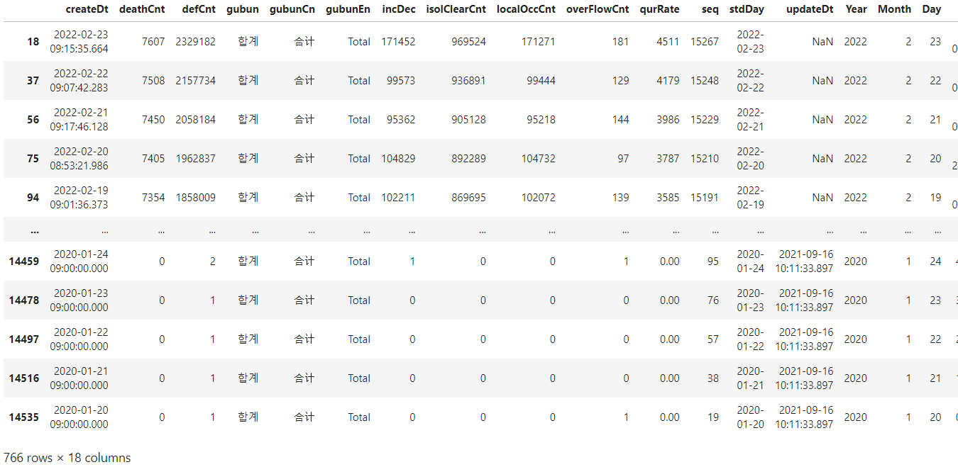 처음 언급했듯이 사용되고 있는 데이터는 2020년부터 2022년 2월까지의 데이터를 담고 있습니다. 그리고 분석 시 년도별 코로나 발생 인원이 몇명인지 알고 싶을 때 groupby를 사용하여 계산을 해 보겠습니다. 우선, 데이터를 보면 시도 데이터 뿐만이 아니라 합계, 검역 같은 데이터 행도 있습니다. 여기서 전체 발생인원을 파악하여야 하니까 '합계' 행만 추출하여 계산하도록 하겠습니다. 우선 원본 df에서 gubun이 '합계'인 행만 추출해 줍니다.