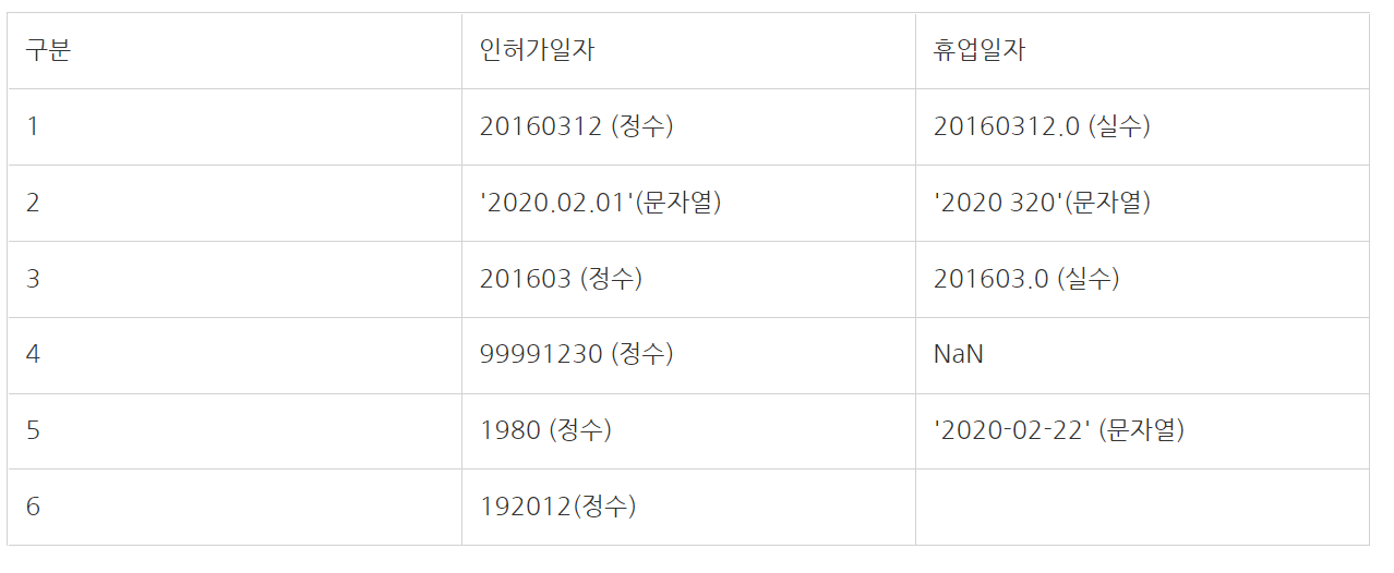 위의 경우 인허가일자와 휴업 일자가 문자열도 섞여있고 중간에 NaN값, 스트링 안에 필요 없는 부호, 빈 값까지..