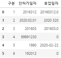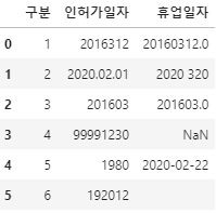 '휴업일자':[20160312.0,'2020 320',201603.0,NaN,'2020-02-22','']})